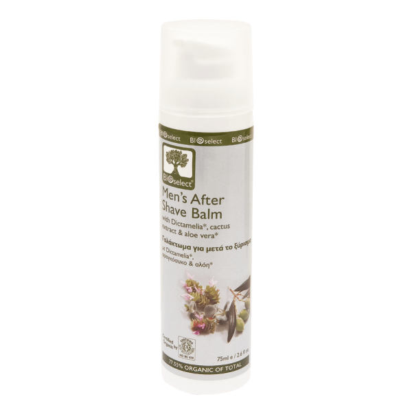 Mens organic light, non oily and easily absorbed after shave balm. Its soothing properties calm razor-burned irritations leaving skin smooth and refreshed. Contains Dictamelia, a unique patented combination of extra virgin olive oil and the Dictamo herb – renowned in Greece since ancient times for its amazing health benefits and healing properties to help rejuvenate the skin and body. Cactus extract, Aloe Vera and Allantoin soothe calm and provide anti-irritant protection. Certified by: AIAB-ICEA.